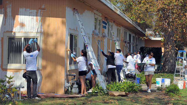 Many communities come together on Make a Difference Day to help others like this group painting a health clinic in Long Beach, California.
