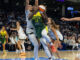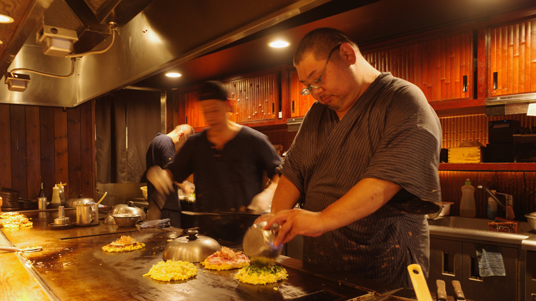 A chef prepares okonomiyaki, a traditional Japanese pancake, on a hot grill.
