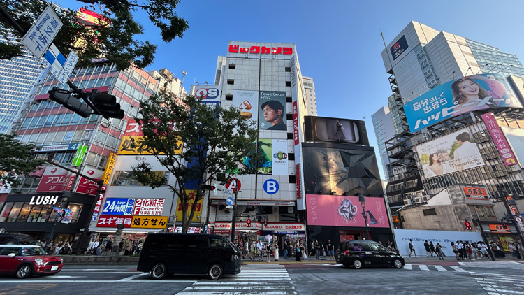 A street scene in Shibuya—near the world-famous Shibuya Crossing—shows Tokyo’s fast pace.