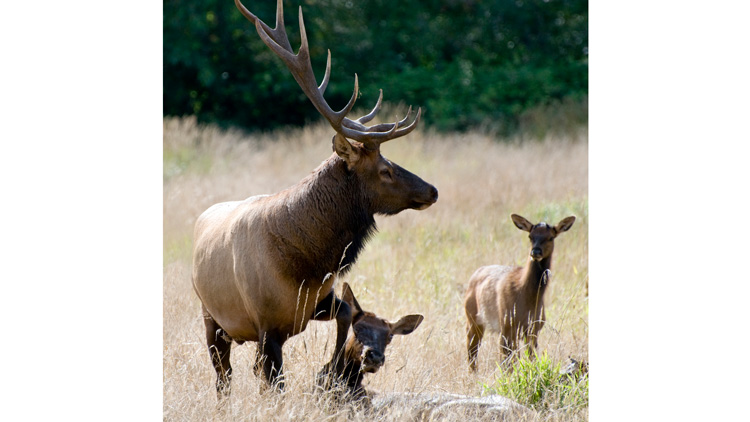 In 2022, scientists discovered that coastal redwoods have two types of leaves. One type is familiar to you. It has a waxy coating to help keep water out. Chloroplasts inside the leaves absorb energy from sunlight and use it to undergo photosynthesis (a process that converts light energy, water, and carbon dioxide into sugars and give off oxygen). The second leaf type is adapted to absorb water. It lacks a waxy coating. It has fewer stomata (pores in the bottom of leaves that open and close to let in air or give off water vapor). It has more space to store water compared to the other leaf type. Using these leaves, a coastal redwood can absorb over 13 gallons of water in one hour! What other organisms are found in Redwood National and State Parks? The parks are home to other trees and plants that thrive in the parks’ different ecosystems (all the living and nonliving things in a given area), including Douglas firs, hemlocks, and ferns. Animals, including slugs, salamanders, bald eagles, bears, and Roosevelt elk, also call the parks home.