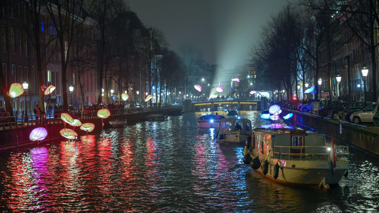 A trail of light along a canal at the Amsterdam Light Festival.