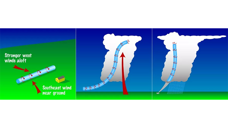 In some thunderstorms, called supercells, the updrafts start to rotate, or spin. This happens when the wind is blowing in one direction near the ground and in another direction higher up in the atmosphere. In a different area of the supercell, the cooler air that has moved down toward the ground also starts to spin. This spinning column of air starts out horizontally. But it can be pulled up, vertically, by the larger updrafts that are also spinning. A funnel cloud (a rotating column of condensed water droplets the extends down from the base of a thunderstorm) can form. If the funnel cloud touches the ground, it becomes a tornado.
